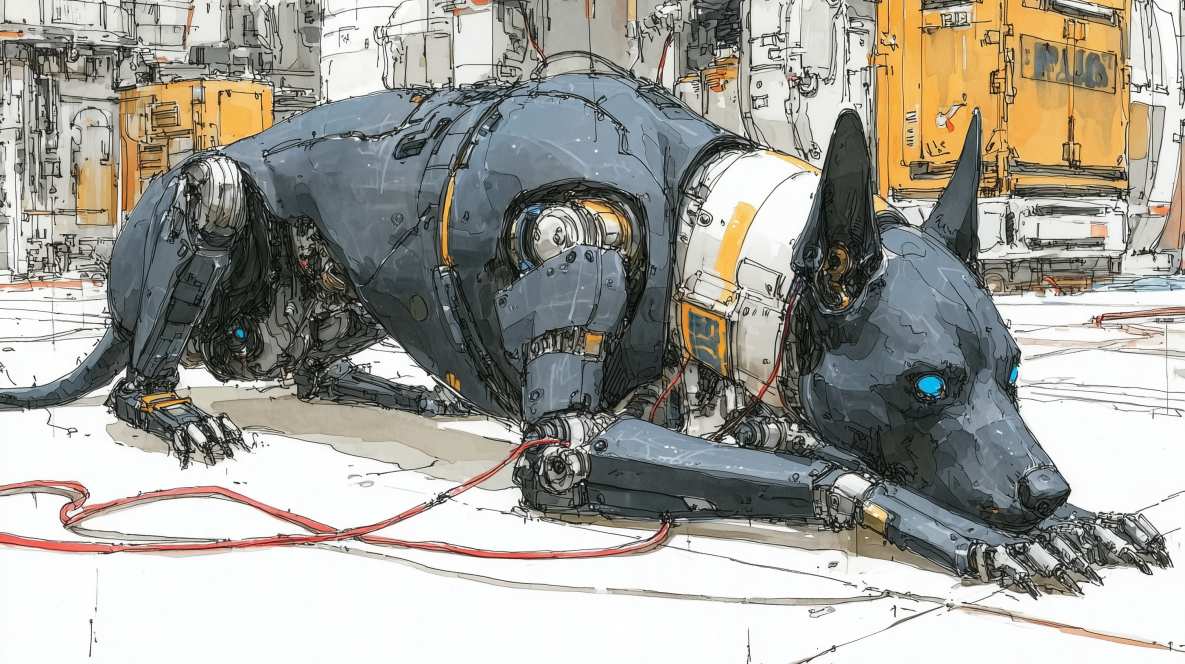 The interior was cold and clean, the opposite of everything outside. Blinking consoles. Tangled cables. A hum of machinery. And in the center, locked into a cradle of steel arms and wires, a robot dog.